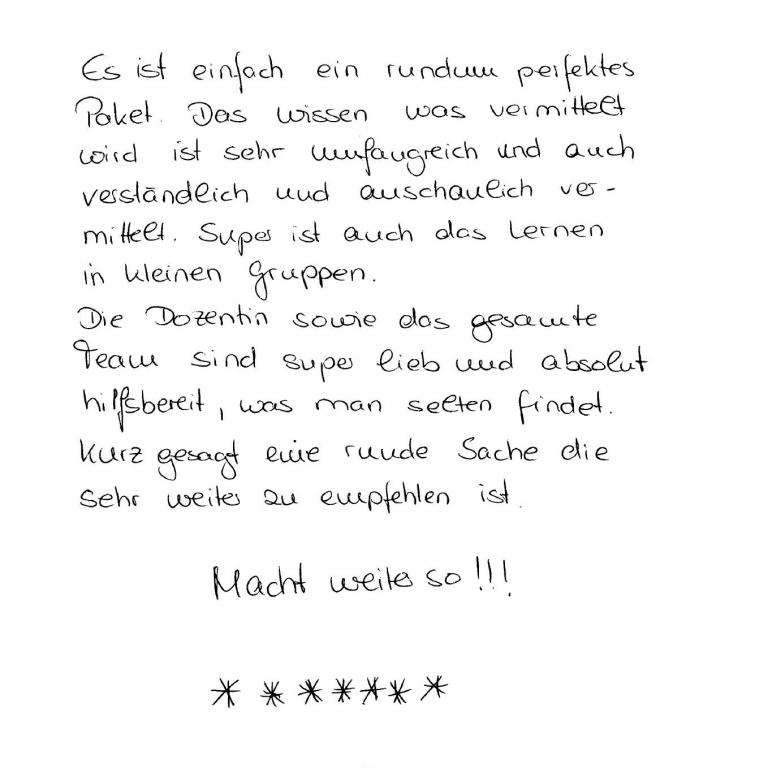 Elke Werz-Nöll Ich habe diesen Kurs vor einem Jahr gemacht. Und kann ihn nur empfehlen. Lernt man die Dozenten kennen , fühlt man sich sofort gut aufgehoben. Der Unterricht gestaltet sich interessant und abwechslungsreich und ist inhaltlich verständlich gegliedert. Die Dozenten sind stets Hilfe, geduldig und mehr als freundlich. Sie haben die Gabe selbst schwierig Themen sehr anschaulich und verständlich zu erklären. Durch lustig Geschichten und Vergleiche pràgt sich der Unterrichtsstoff leicht ein. Auf die Wünsche, Bedürfnisse und Fragen der einzelnen Schüler wird jederzeit mehr als ausführlich eingegangen. Das Tempo des Unterrichts wird dem schwächsten Schüler angepasst. Die Prüfung wird gut vorbereitet. Und ich bin nach einem Jahr in fester Anstellungen immer noch dankbar und froh das ich mich für diese Schule entschieden habe